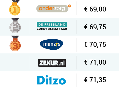 De duurste zorgverzekering met het standaard eigen risico van € 385 komt van de Amersfoortse: € 107,95.