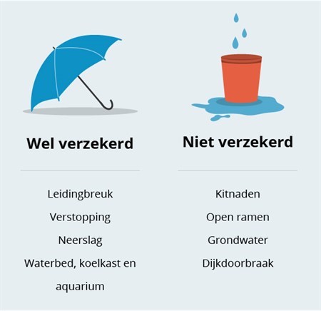 Als er water wegloopt uit een waterbed of aquarium, dan is de gevolgschade verzekerd. Het kapotte waterbed of aquarium is niet gedekt. Sommige verzekeraars stellen extra voorwaarden, bijvoorbeeld dat het kapotte waterbed niet ouder mag zijn dan tien jaar. Als een koelkast of vriezer uitvalt, dan bestaat er ook een kans dat er veel vocht wegstroomt. Ook dat is meeverzekerd. Sommige inboedelverzekeraars vergoeden dan overigens ook de bedorven inhoud van de vriezer of koelkast.