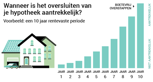 Je boete en voordeel zijn ongeveer net zo groot. Zou oversluiten dan toch zinvol kunnen zijn? Ja, als je het fijn vindt nu al de zekerheid te hebben van tien jaar een vaste lage rente. Vergeet daarbij niet de oversluitkosten mee te rekenen!