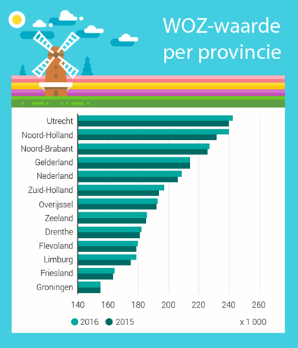 Ieder jaar stelt de gemeente de waarde van je huis vast. Begin dit jaar bedroeg de gemiddelde WOZ-waarde 209.000 euro. Met een plus van 1,5 procent is hiermee de eerste gemiddelde stijging in zes jaar een feit. In Amsterdam, waar betaalde woonruimte schaars is, bedraagt de stijging 9 procent. Overigens is niet in elke gemeente sprake van een toename. Onderaan de lijst staat Elburg (Gelderland), waar de gemiddelde WOZ-waarde juist 9 procent daalt.