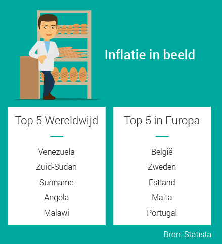 Wereldwijd steekt Venezuela, samen met Zuid-Sudan, met kop en schouders boven de rest uit als het gaat om hoge inflatie. Ook een land als Suriname kampt nog met een hoge inflatie van boven de 50%. In andere niet-Europese landen schommelt de inflatie tussen de 10% en 30%. Denk aan landen als Ghana, Oekraïne, Wit-Rusland en Egypte.