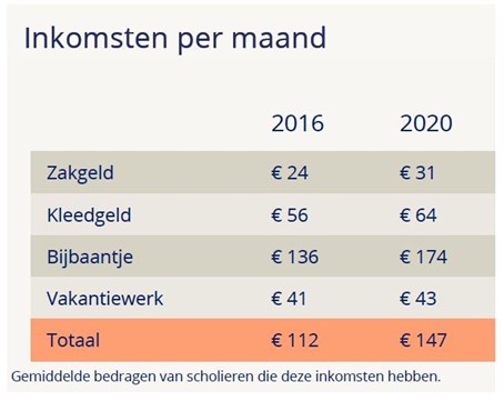 Gemiddeld bedragen de inkomsten van scholieren maandelijks €147, een stijging van €35 vergeleken met het vorige onderzoek uit 2016. Net als destijds krijgt bijna 90 procent van de scholieren zakgeld, wel krijgen ze nu iets meer. Meer ouders geven hun schoolgaande kinderen kleedgeld, dit percentage is gestegen van 38 naar 50 procent. Aan bijbaantjes besteden scholieren nu één uur per week meer.