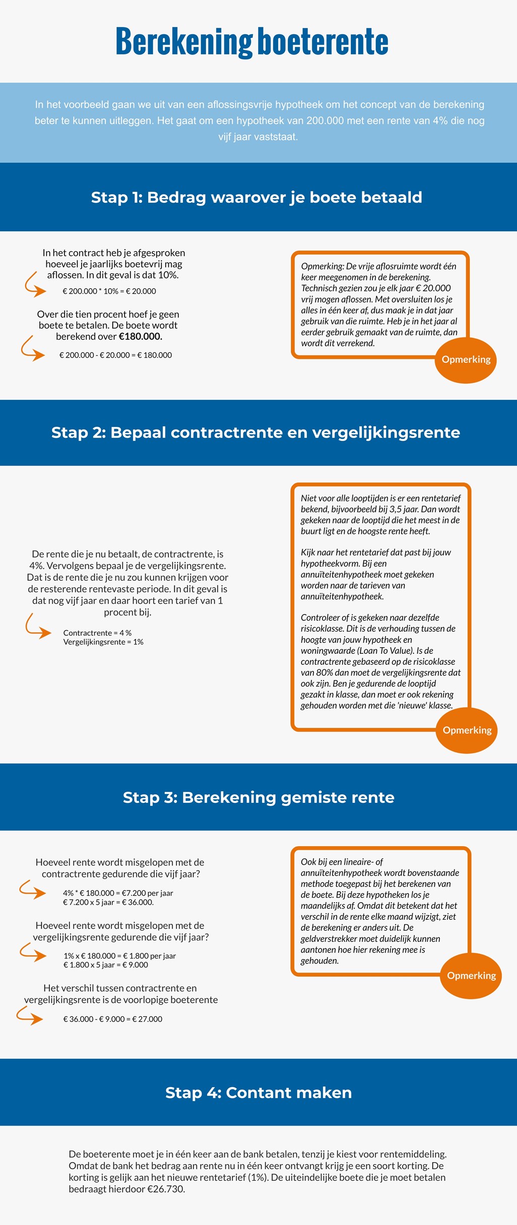 In het verleden is er veel ‘te doen’ geweest over de berekening van de boeterente. Banken rekenden soms meer boete dan de daadwerkelijke terugval van inkomen. Dat mag nu niet meer en de berekening moet transparant aan je worden voorgelegd. In onderstaand voorbeeld leggen we uit hoe de boeterente wordt berekend en waarop je kunt letten als je de boete controleert.