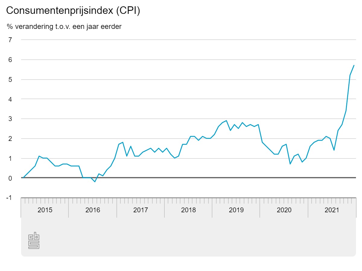 De inflatie kwam in december uit op 5,7 procent, meldt het CBS. Hierdoor was je voor veel aankopen duurder uit dan een jaar eerder. Vooral energie zorgde eind vorig jaar voor een piek. De huur en hypotheekrente worden niet meegenomen bij het berekenen van de inflatie. Wel bestaat het risico dat je ook voor deze zaken meer gaat betalen.